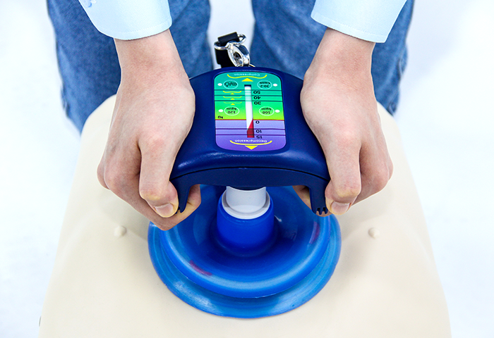 Manomètre intégré pour surveiller la profondeur. Le dynamomètre guide à la fois les forces de compression et de décompression. Le métronome guide le taux de compression/décompression et le cycle de service appropriés.