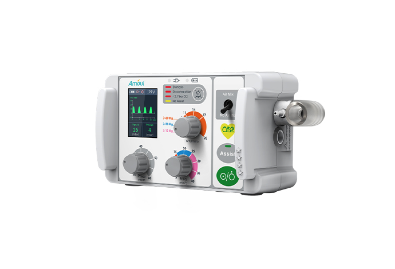 A tela TFT colorida exibe em tempo real a pressão das vias aéreas, o modo respiratório e outras informações. A função de mistura de ar-oxigênio de alta eficiência garante maior rendimento dos cilindros de oxigênio usados. O 6000S possui certificação EN 1789 da UE para uso em ambulância e resistência contra quedas e vibrações. Além disso, foi desenvolvido em conformidade com as mais recentes diretrizes da Associação Americana do Coração (AHA) e do Conselho Europeu de Ressuscitação (ERC).